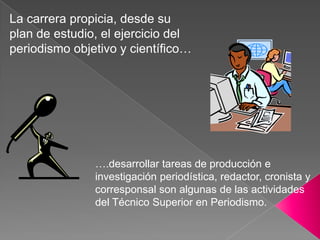 El documento describe la carrera de periodismo en el Instituto Hernando Arias de Saavedra. El plan de estudios busca formar profesionales objetivos y científicos capaces de desempeñarse como redactores, cronistas o corresponsales. El instituto apunta a que los estudiantes egresados puedan insertarse directamente en el mundo laboral. Se detallan las materias del primer año, incluyendo Comunicación Social, Historia del Periodismo, Producción de Textos y una práctica profesional para acercarse al trabajo periodístico.
