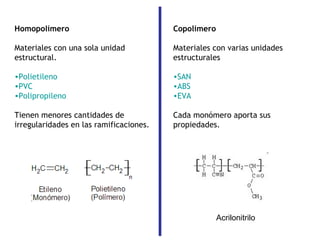 El documento resume las propiedades y procesos de transformación de varios plásticos comunes como ABS, acrílico, nylon, PET y estireno. Describe las características físicas y químicas de cada plástico, sus aplicaciones típicas, y los procesos de moldeo como termoformado y rotomoldeo que se usan para darles forma.