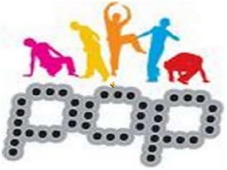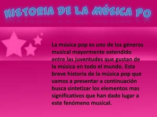 Este documento resume brevemente la historia de la música pop. Comienza con los orígenes del rock and roll en 1955, pero este género disminuyó en popularidad hacia 1958 cuando varias estrellas se alejaron de la música. Luego, la aparición de The Beatles en 1962 generó una ola de nuevos grupos pop en Gran Bretaña y Estados Unidos. Finalmente, el estilo disco se hizo popular a fines de 1974 con artistas como Gloria Gaynor y Donna Summer, lo que llevó la música pop a un nuevo nivel de especialización