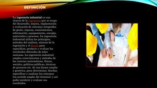 La ingeniería industrial se ocupa del desarrollo, mejora, implementación y evaluación de sistemas integrados que incluyen personas, recursos, conocimientos, equipos, energía y materiales. Los ingenieros industriales utilizan principios de ingeniería y análisis para especificar, predecir y evaluar los resultados de estos sistemas. Trabajan para optimizar procesos como producción, costos, distribución, logística y más, con el objetivo de mejorar la calidad y productividad.