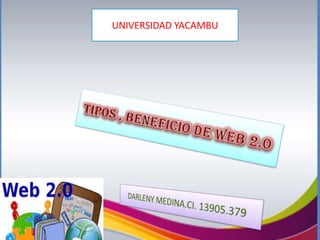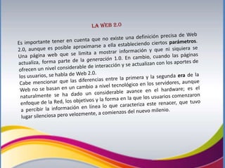 El documento describe cuatro tipos principales de herramientas web 2.0: 1) aplicaciones para compartir recursos como fotos y videos; 2) herramientas para crear recursos como wikis y blogs; 3) servicios para recuperar información como redes sociales; y 4) redes sociales para crear comunidades virtuales. Las herramientas pueden usarse directamente en la web o descargando el código fuente para una configuración más personalizada.
