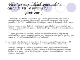 La ministra de Salud afirmó que hubo responsabilidad compartida en el caso de 25 pacientes en el Hospital de Iquique que no fueron notificados de ser portadores de VIH, cuatro de los cuales fallecieron. El caso salió a luz luego de la muerte de una paciente que no sabía que tenía VIH. La subsecretaria de Salud calificó la situación como inexplicable y se abrió una investigación.