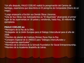Paulo Coelho nació en 1947 en Río de Janeiro, Brasil. Fue internado tres veces en una clínica psiquiátrica cuando era adolescente y se unió al movimiento hippie en 1970, abandonando sus estudios para viajar por Sudamérica. Su primera novela, Arquivos do Inferno, pasó desapercibida en 1982, pero alcanzó fama internacional con la publicación de El Alquimista en 1988, la cual ha vendido más de 30 millones de copias en todo el mundo. Coelho es un reconocido escritor brasileño,
