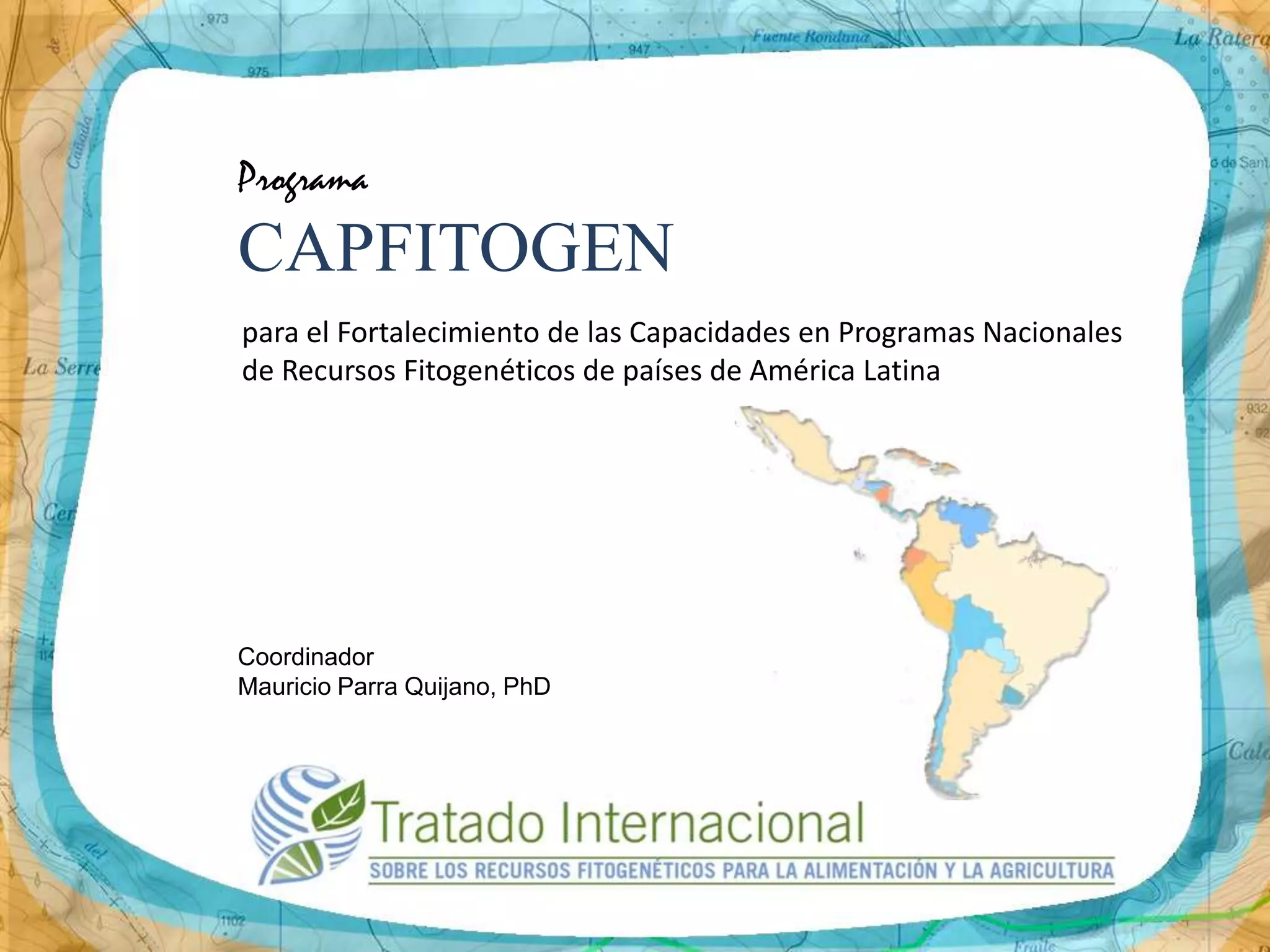 El documento presenta el programa Capfitogen, diseñado para fortalecer las capacidades en los programas nacionales de recursos fitogenéticos en América Latina, enfatizando la creación de capacidad y la transferencia de tecnología. Se priorizan acciones como el establecimiento de programas de enseñanza y la realización de investigaciones científicas en colaboración con países en desarrollo. Además, se destacan las herramientas del programa que son accesibles y utilizables localmente, con un enfoque en la simplificación y rigor científico.
