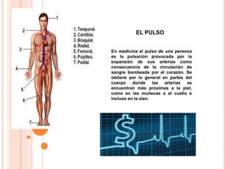 Este documento describe cómo medir el pulso en diferentes partes del cuerpo, incluidas las muñecas, el cuello y el pecho. Explica que la frecuencia cardíaca, medida en latidos por minuto, varía según factores como la edad, el sexo y el nivel de actividad física. También destaca la importancia de medir la frecuencia cardíaca para dosificar adecuadamente el ejercicio y desarrollar un plan de entrenamiento efectivo.
