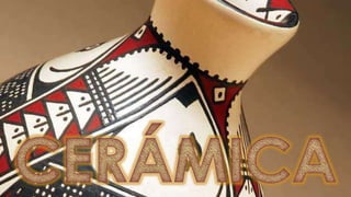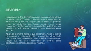 El documento proporciona información sobre la historia, definición, características, constitución, clasificación, usos y proceso productivo de la cerámica. La cerámica data de hace 9000 años y se originó en Anatolia como recipientes endurecidos al sol. Más tarde se empezó a cocer con fuego y se usó para fabricar vasijas y contenedores domésticos.