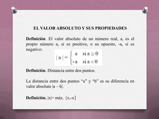 Este documento describe las propiedades y definiciones del valor absoluto. Explica que el valor absoluto de un número real es el propio número si es positivo, o su opuesto si es negativo. También define la distancia entre dos puntos como su diferencia en valor absoluto. Finalmente, cubre las propiedades fundamentales del valor absoluto como no negativa, definida positivamente y multiplicativa.