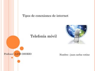 Este documento describe diferentes tipos de conexiones de internet móvil como GSM, GPRS, UMTS y HSDPA. GSM permite conectarse a través de un teléfono celular para enviar y recibir correos electrónicos y navegar por internet. GPRS es una tecnología de tercera generación que sucede a GSM. UMTS, también conocida como 3G+, es una optimización de WCDMA que puede alcanzar tasas de descarga de hasta 14 Mbps. HSDPA también mejora WCDMA para tasas promedio de 1 Mbps