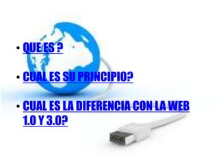 La Web 2.0 permite a los usuarios crear y compartir contenido en sitios web interactivos, a diferencia de la Web 1.0 que solo permitía leer contenido publicado por otros. La Web 3.0 evolucionará hacia una red semántica más inteligente. La Web 2.0 facilita la interacción y colaboración entre usuarios a través de plataformas como YouTube, mientras que la Web 1.0 limitaba a los usuarios solo a leer contenido.