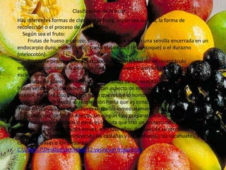 La fruta se define como aquellos frutos comestibles obtenidos de plantas cultivadas o silvestres que se consumen principalmente en su estado fresco debido a su sabor dulce-ácido y sus propiedades nutritivas. Existen diferentes formas de clasificar la fruta, como por su tipo (de hueso, pepita o grano), por su proceso de maduración (fresca o seca), o por su forma de recolección. La fruta contiene principalmente agua y carbohidratos como azúcares, además de micronutrientes que br