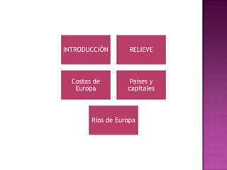 Europa es un continente pequeño pero muy variado, con una gran llanura en el centro y este, y varios sistemas montañosos como los Alpes y los Cárpatos. Tiene varias penínsulas como la ibérica e islas como Gran Bretaña e Islandia. Sus principales ríos incluyen el Danubio, Rin y Po, que desembocan en el mar Negro, Atlántico y Mediterráneo. Algunas de sus capitales son Oslo, Viena, Madrid, París, Atenas, Londres, Moscú y Bru