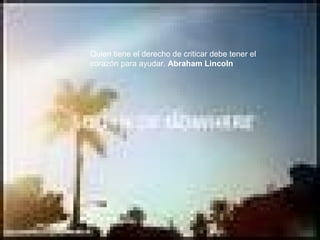 Este documento contiene citas de tres pensadores sobre la positividad, el amor y la ayuda a los demás. Abraham Lincoln dice que solo aquellos con corazón para ayudar tienen derecho a criticar. Platón señala que al buscar el bien de los demás también encontramos el nuestro. El documento invita a disfrutar pensamientos positivos que revivan la pasión por la vida.