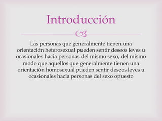 El documento presenta información sobre la homosexualidad. Define la homosexualidad como la atracción sexual e interacción entre personas del mismo sexo. Explica que aunque tradicionalmente se ha considerado como una enfermedad, la orientación homosexual es individual. Concluye invitando a los lectores a considerar el tema de manera reflexiva y objetiva.