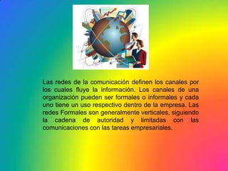 Este documento describe diferentes tipos de redes de comunicación, incluyendo redes formales e informales dentro de una organización, así como redes de área local, redes globales como Internet, y los elementos necesarios para el funcionamiento de las redes como acceso, transporte de información, conmutación, señalización y protocolos.