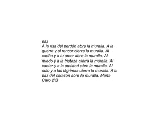 El documento habla sobre mantener una actitud positiva abriendo el corazón a sentimientos como la esperanza, alegría y bondad, mientras se cierra el corazón a sentimientos negativos como la tristeza, envidia y maldad. También menciona la importancia de abrir la "muralla" a cosas como el perdón, cariño y amistad, y cerrarla al miedo, odio y lágrimas para alcanzar la paz interior.