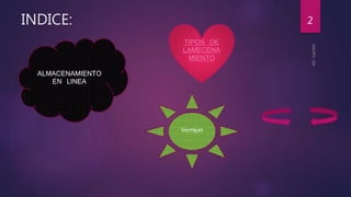 El documento habla sobre el almacenamiento en línea, explicando que es un servicio gratuito donde se pueden guardar datos, archivos y fotos desde cualquier computadora con acceso a Internet. Algunas ventajas del almacenamiento en línea incluyen la capacidad de editar archivos de Word, Excel y PowerPoint desde cualquier PC, así como guardar información importante de manera accesible. Algunos proveedores populares de almacenamiento en la nube mencionados son Dropbox, Google Drive, Box y SkyDrive.