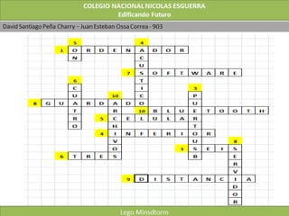 Este documento presenta 10 preguntas horizontales y 10 preguntas verticales sobre el robot Lego Mindstorms NXT. Algunas preguntas clave son: ¿Qué controla el ladrillo NXT?, ¿Qué sensor responde a las acciones del NXT?, ¿En qué parte encaja la batería recargable? Y ¿El cerebro del robot es un qué? El documento parece ser un conjunto de preguntas de repaso sobre las características y componentes básicos del robot Lego Mindstorms NXT.