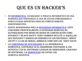 Este documento describe diferentes tipos de hackers y sus actividades. Define a los hackers como personas apasionadas por la seguridad informática o la comunidad de aficionados a la informática, y explica que pueden tener connotaciones positivas o negativas. También describe roles de activismo de los hackers y diferentes tipos de virus e intrusos informáticos como virus de boot, gusanos, troyanos y keyloggers.