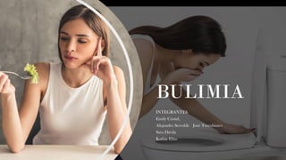 La bulimia es un trastorno alimentario grave caracterizado por episodios de atracones seguidos de conductas de purga como el vómito o uso de laxantes. Afecta principalmente a adolescentes y jóvenes mujeres. El tratamiento involucra terapia psicológica, medicamentos y cambios en los hábitos alimenticios para establecer una relación sana con la comida y el cuerpo. Las personas cercanas deben brindar apoyo y comprensión sin juzgar, para ayudar al paciente a superar este trastorno.