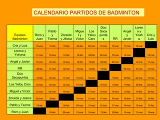 El documento presenta el calendario de partidos de diferentes deportes como badminton, voleybol, baloncesto, fútbol sala en diferentes fechas. Se enumeran los equipos participantes en cada deporte y las fechas de sus respectivos partidos.