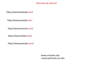 Este documento lista diferentes dominios de internet como ejemplos para ilustrar los tipos de extensiones de dominio como .com, .edu, .gov, .net y .org. También incluye una lista numérica y una imagen que muestra las partes principales de una ventana de navegador web.