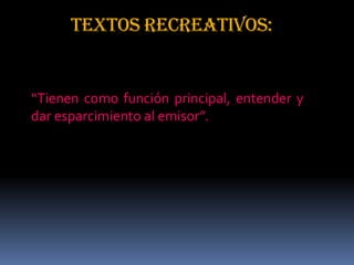Este documento presenta una discusión sobre diferentes tipos de textos recreativos populares y literarios. Explora las características internas y externas de adivinanzas, refranes, canciones, historietas, cuentos, poemas y sainetes. Incluye ejemplos de cada uno de estos géneros. El documento concluye con una breve bibliografía sobre los temas cubiertos.