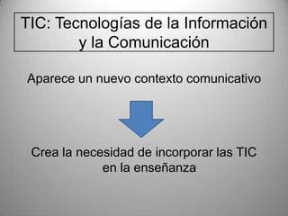 El documento introduce las tecnologías de la información y la comunicación (TIC) en la enseñanza y analiza sus ventajas e inconvenientes para profesores, alumnos y centros educativos. Los roles de profesores y alumnos cambian, volviéndose el profesor un orientador y el alumno más autónomo y crítico. Las TIC ofrecen recursos educativos pero también estrés para los profesores y adicción para los alumnos. Los centros se benefician de menores costes pero enfrentan gastos en formación y equipos
