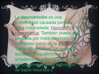 La desnutrición es causada por una dieta inadecuada y puede afectar factores sociales, psiquiátricos o de salud. Provoca niños delgados y enfermizos con problemas de aprendizaje y desarrollo. La desnutrición crónica causa retrasos en el crecimiento y capacidades físicas e intelectuales. Se puede prevenir con una alimentación variada y nutritiva desde la infancia.