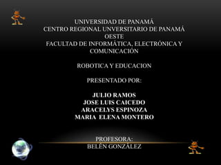 UNIVERSIDAD DE PANAMÁ CENTROREGIONAL UNVERSITARIO DE PANAMÁ OESTE FACULTAD DE INFORMÁTICA, ELECTRÓNICA Y COMUNICACIÓN ROBOTICA Y EDUCACION PRESENTADO POR: JULIO RAMOS JOSE LUIS CAICEDO ARACELYS ESPINOZA MARIA ELENA MONTERO PROFESORA: BELÊN GONZÂLEZ