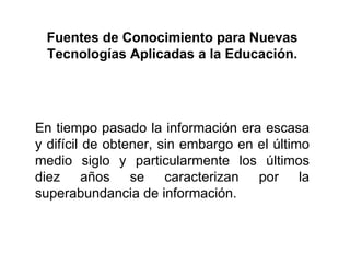 El documento describe varias fuentes de conocimiento sobre nuevas tecnologías aplicadas a la educación, incluyendo bases de datos electrónicas, recursos de Internet y congresos científicos. Explica que las bases de datos en CD-ROM ofrecen una gran capacidad de almacenamiento y rapidez en la obtención de información, aunque tienen limitaciones como no poder actualizar los archivos. También destaca que recursos en Internet como el correo electrónico y motores de búsqueda permiten el acceso a publicaciones y el intercambio con expertos.