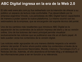 ABC Digital ingresaen la era de la Web 2.0 El sitio web www.abc.com.py fue rediseñado con la intención de ofrecer a su público un espacio de lectura más confortable. Fue desarrollado por la empresa argentina Vincolo. Los periodistas de ABC Digital fueron capacitados de manera a poder operar la nueva plataforma. Lo mismo ocurrió con los webmasters de la empresa, que se encargarán del soporte técnico del portal. Uno de los cambios más resaltantes que introduce ABC Digital es la separación de los contenidos de la edición impresa del diario y de su versión online. Uno de los botones del menú principal permite visualizar exclusivamente las noticias que se publicaron ese día en el diario papel. Al lado pueden verse los contenidos de la versión digital. Las noticias están agrupadas de una manera distinta respecto a la versión anterior del portal. El lector ahora podrá visitar los contenidos a través de la portada y de las secciones Nacionales, Mundo, Ciencia y Tecnología (CyT), y Noticias del día. Además, el sitio abandona el formato blog y el destaque de las informaciones pasa a ser en función a su relevancia.