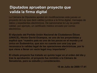 Diputados aprueban proyectoque valida la firma digital La Cámara de Diputados aprobó sin modificaciones este jueves un proyecto de Ley que dará validez jurídica a la firma digital, mensajes de datos y expedientes electrónicos. De sancionarse la Ley se podrá validar, por ejemplo, un certificado médico enviado por correo electrónico. El diputado del Partido Unión Nacional de Ciudadanos Éticos (UNACE), Héctor David Ocampos, es uno de los proyectistas y explicó que “nuestro país es uno de los pocos en el mundo y el único en Sudamérica, que aún no cuenta con una Ley que reconozca la validez legal de las operaciones electrónicas, por lo que viene a llenar un vacío legal muy importante”. El citado proyecto fue tratado en quinto lugar en el orden del día y tras la aprobación, el proyecto fue remitido a la Cámara de Senadores, para su estudio y consideración. 16 de Julio de 2009 17:41