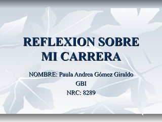 Paula Andrea Gómez Giraldo está reflexionando sobre su carrera. Sus razones para elegir este campo incluyen promover el cambio social, resolver problemas humanos en la comunidad e interactuar con personas. Como trabajadora social, orientaría a personas y grupos para desarrollar capacidades de resolución de problemas sociales, individuales y colectivos mediante el diálogo. Sus áreas de acción potenciales incluyen la tercera edad, víctimas de maltrato y exclusión social.