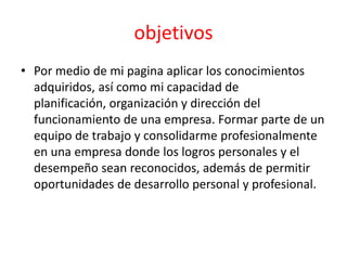 La candidata Jessica Arias presenta sus objetivos profesionales de aplicar sus conocimientos y capacidades de planificación, organización y liderazgo en una empresa donde pueda desarrollarse profesionalmente. Su visión es liderar una empresa que ofrezca servicios en más países con un excelente servicio centrado en las necesidades de los clientes para convertirse en una opción innovadora por su calidad y agilidad. Su página trata sobre la importancia de la innovación, objetivos claros, nuevas ideas y estrategias para mejorar continuamente la empresa.