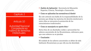 Este documento contiene extractos de varios artículos relacionados con la protección de la propiedad intelectual, la investigación científica, la innovación y los saberes ancestrales. Los artículos describen las responsabilidades de las autoridades nacionales en estas áreas, la importancia de proteger las ideas y los conocimientos tradicionales, y el deber de apoyar el desarrollo científico y tecnológico de una manera ética.