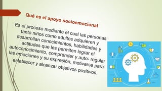 Este documento describe el aprendizaje socioemocional y sus beneficios. Explica que las habilidades socioemocionales incluyen el manejo de emociones, toma de decisiones, resolución de conflictos y habilidades interpersonales. Estas habilidades se pueden aprender y desarrollar desde la niñez hasta la edad adulta. El documento también proporciona ejemplos de actividades para el desarrollo del aprendizaje socioemocional en tiempos de pandemia.