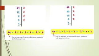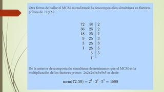 El documento explica cómo descomponer números enteros en factores primos a través de divisiones sucesivas hasta reducir el número a la unidad. También describe cómo encontrar el Máximo Común Divisor (MCD) de dos números mediante la identificación de sus divisores comunes o factores primos comunes con el menor exponente. A continuación, pide resolver ejercicios prácticos de descomposición de números en factores primos y cálculo del MCD.