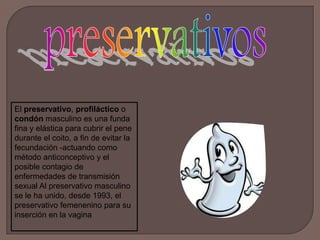 Los principales métodos anticonceptivos son los preservativos, tanto masculinos como femeninos, y las pastillas anticonceptivas. Los preservativos son fundas finas y elásticas que cubren el pene o se insertan en la vagina para prevenir embarazos y enfermedades. Las pastillas anticonceptivas, también conocidas como la píldora, son tabletas que contienen hormonas femeninas sintéticas como el estrógeno y la progesterona, y se toman diariamente para evitar embarazos.