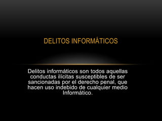 Este documento describe varios tipos de delitos informáticos, incluyendo virus, acceso no autorizado, fraude, falsificación, piratería informática, difusión de pornografía infantil, y ciberterrorismo. Explica que los delitos informáticos son conductas ilícitas que hacen uso indebido de medios informáticos y pueden incluir la manipulación de datos, programas o documentos de manera fraudulenta. También menciona que a pesar de la gran cantidad de delitos que se cometen en línea, hasta el momento no se han aplic