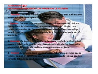 Este documento describe el caso de una niña de 6 años con autismo leve que presenta caries rampantes. Durante su primera consulta odontológica, mostró un comportamiento aprensivo y no colaboró con el tratamiento. Se logró adaptar a la niña a través de la técnica de decir-mostrar-hacer, mejorando su conducta. Se predice que la niña seguirá colaborando si se gana su confianza y se la adapta a cada consulta debido a su condición de autismo.