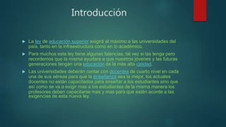 La nueva legislación establece un Sistema Nacional de Evaluación y Acreditación para mejorar la calidad de la educación superior universitaria en Panamá. El sistema incluye procesos de autoevaluación institucional y de programas, evaluación externa por pares académicos y acreditación a través del Consejo Nacional de Evaluación y Acreditación Universitaria. La ley también establece nuevos requisitos para las universidades como contar con docentes de cuarto nivel, ofrecer becas a estudiantes con mérito y someterse a proces