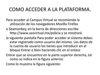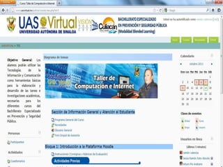 Este documento describe la estructura de la plataforma virtual de la Universidad Autónoma de Sinaloa (UAS Virtual) utilizada para el Bachillerato Especializado en Prevención y Seguridad Pública. Explica que la plataforma consta de una cabecera, columna central, columna derecha, columna izquierda y pie de página, y describe brevemente los elementos incluidos en cada sección.