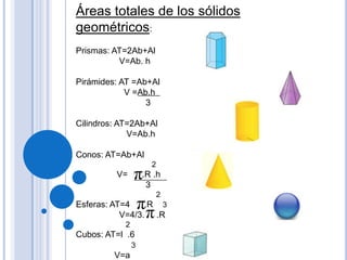 Este documento proporciona fórmulas para calcular el área total (AT) y el volumen (V) de varias figuras geométricas sólidas como prismas, pirámides, cilindros, conos, esferas y cubos.