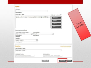 El documento habla sobre cómo utilizar la opción de borrador en un blog. Un borrador permite guardar una entrada que aún no está terminada y no aparece publicada, pero puede editarse más tarde. Los borradores son útiles para guardar el progreso de un post largo que se está escribiendo gradualmente. Para crear un borrador, se guarda la entrada sin publicarla. El documento también cubre cómo diseñar un blog eligiendo un título relevante y tema, y organizando las publicaciones por categorías.