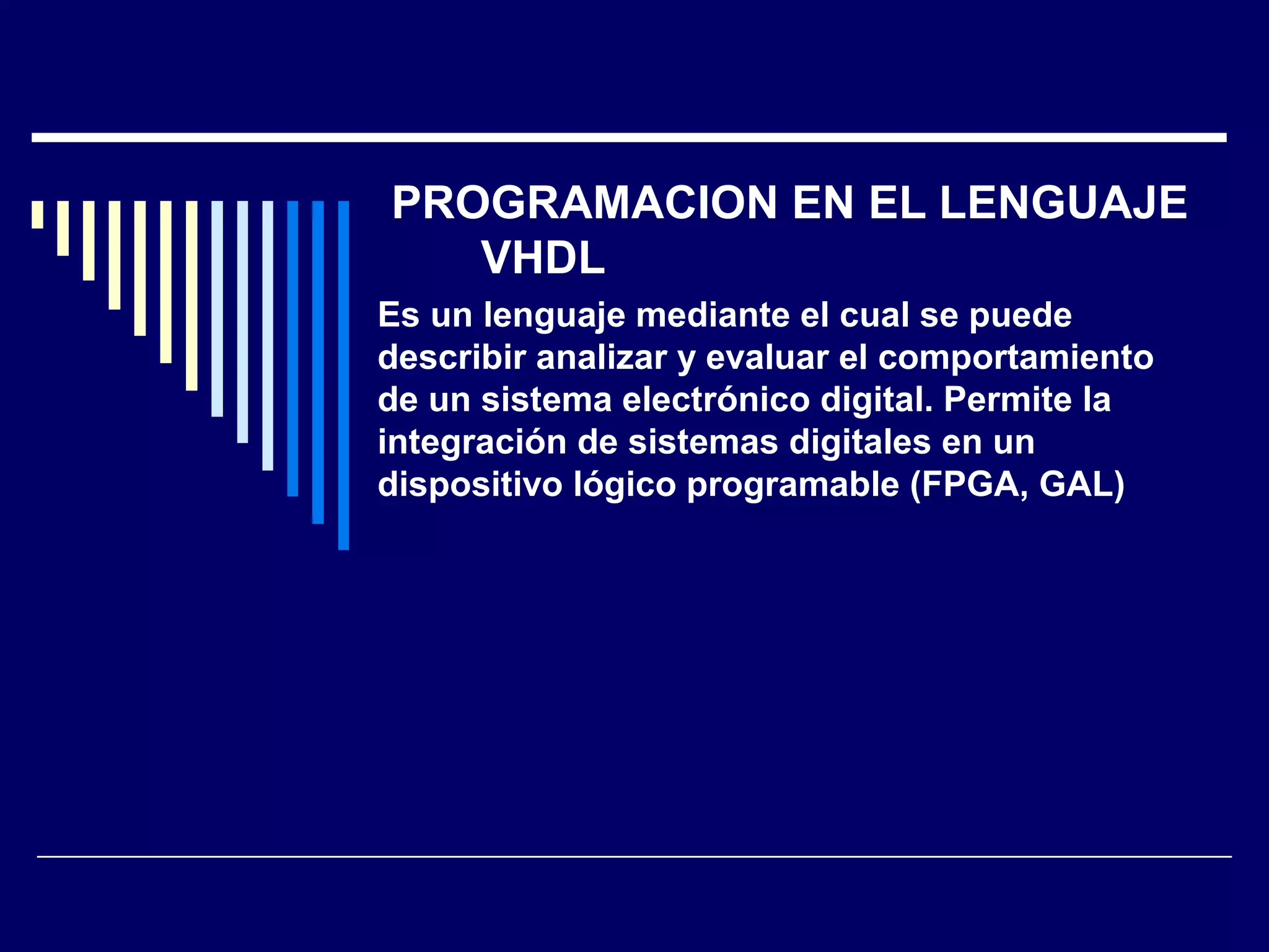 VHDL es un lenguaje que permite describir, analizar y evaluar el comportamiento de sistemas electrónicos digitales. Los programas en VHDL están compuestos de unidades de diseño como entidades, arquitecturas y configuraciones que definen la estructura y comportamiento del sistema. Las entidades representan los componentes electrónicos y sus conexiones, mientras que las arquitecturas describen su funcionamiento interno mediante declaraciones como procesos, funciones y ecuaciones booleanas.