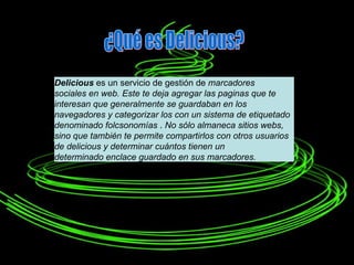 Delicious es un servicio social de marcadores web que permite a los usuarios agregar páginas de interés, categorizarlas con etiquetas, y compartirlas con otros. Los usuarios pueden acceder a sus marcadores favoritos desde cualquier computadora conectada a Internet. Delicious reduce todos los marcadores de un usuario a un solo conjunto accesible desde cualquier lugar, e incluso permite ver los marcadores compartidos por otros.