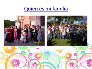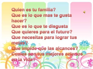 Este documento describe la familia y amigos de la persona, las actividades que más disfruta como estar con ellos y comer tacos, así como sus metas de tener éxito en su carrera y ser feliz. También menciona lo que le disgusta como el maltrato animal y la falta de iniciativa en otros, y los obstáculos que enfrenta como la irresponsabilidad y dejarse estresar por detalles.