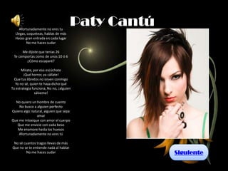 El documento presenta una variedad de géneros musicales como el pop en español, pop en inglés, reggaetón, electrónica y canciones de artistas como Paty Cantú, Shakira, Luis Fonsi, Servando y Florentino, Justin Bieber y Demi Lovato. Incluye letras de canciones populares que hablan sobre amor, desamor y superación personal.
