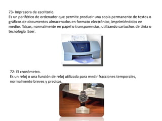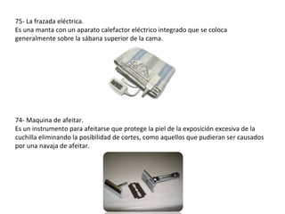 Este documento presenta una lista de objetos cotidianos ordenados de mayor a menor número. Describe brevemente cada objeto, incluyendo su función y algunos detalles históricos. Los objetos mencionados incluyen frazadas eléctricas, máquinas de afeitar, impresoras, cronómetros, proyectores de diapositivas, radios portátiles, cepillos de dientes eléctricos, lámparas, binoculares, cintas métricas, cierres, pistolas, loncheras, parrillas, detectores de hum