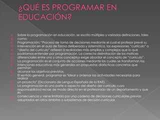 Este documento describe qué es programar. La programación es el proceso de planificar actividades para lograr un proyecto de manera deliberada y sistemática. Implica transformar intenciones educativas generales en propuestas didácticas concretas que permitan alcanzar objetivos. Programar sirve para aumentar la conciencia del profesor sobre su práctica educativa y mejorar la calidad de la educación.